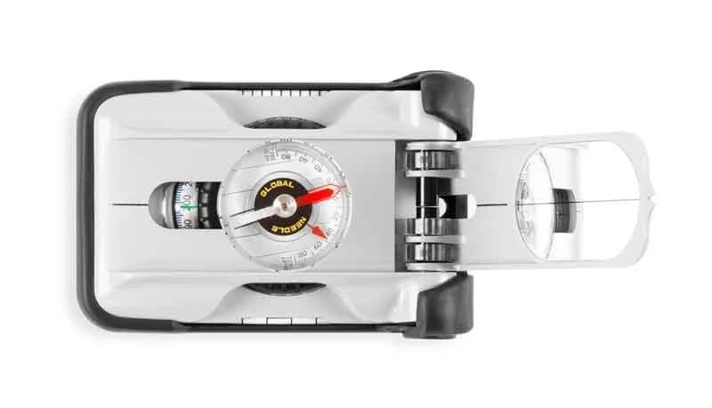 - TruArcTM Global Needle; Ever-North Magnet; Map Magnifier; Sighting Mirror; Bubble Level; Clinometer; Magnified Readout; 1° Resolution.